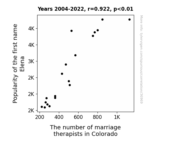 This means 85% of the change in the one variable (i.e., The number of marriage therapists in Colorado) is predictable based on the change in the other (i.e., Popularity of the first name Elena) over the 19 years from 2004 through 2022.
