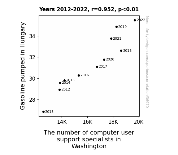 This means 90.6% of the change in the one variable (i.e., The number of computer user support specialists in Washington) is predictable based on the change in the other (i.e., Gasoline pumped in Hungary) over the 11 years from 2012 through 2022.