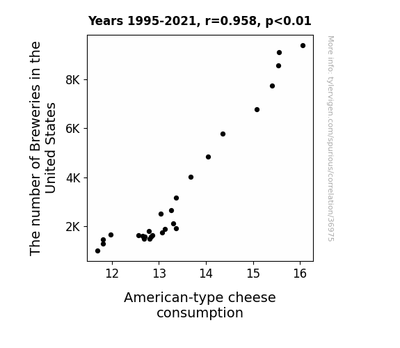 This means 91.7% of the change in the one variable (i.e., American-type cheese consumption) is predictable based on the change in the other (i.e., The number of Breweries in the United States) over the 27 years from 1995 through 2021.