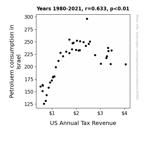 This means 40% of the change in the one variable (i.e., US Annual Tax Revenue) is predictable based on the change in the other (i.e., Petroluem consumption in Israel) over the 42 years from 1980 through 2021.