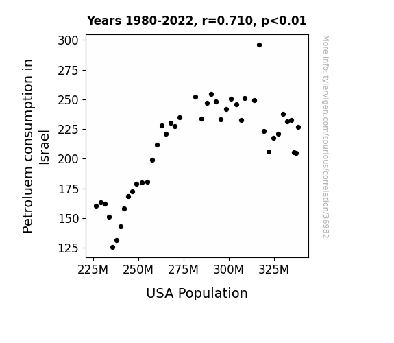 This means 50.4% of the change in the one variable (i.e., USA Population) is predictable based on the change in the other (i.e., Petroluem consumption in Israel) over the 43 years from 1980 through 2022.