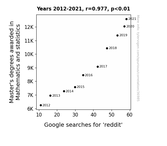 This means 95.4% of the change in the one variable (i.e., Google searches for 'reddit') is predictable based on the change in the other (i.e., Master's degrees awarded in Mathematics and statistics) over the 10 years from 2012 through 2021.