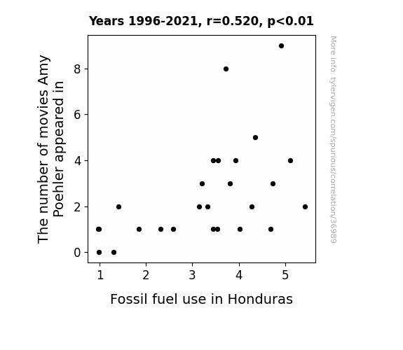 This means 27.1% of the change in the one variable (i.e., Fossil fuel use in Honduras) is predictable based on the change in the other (i.e., The number of movies Amy Poehler appeared in) over the 26 years from 1996 through 2021.