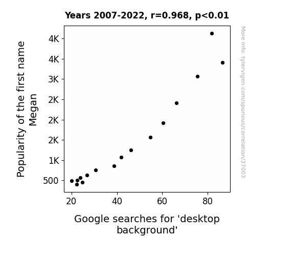 This means 93.7% of the change in the one variable (i.e., Google searches for 'desktop background') is predictable based on the change in the other (i.e., Popularity of the first name Megan) over the 16 years from 2007 through 2022.