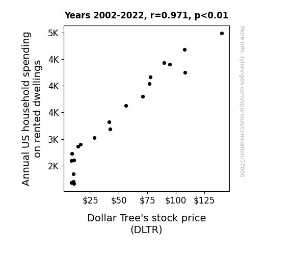 This means 94.2% of the change in the one variable (i.e., Dollar Tree's stock price (DLTR)) is predictable based on the change in the other (i.e., Annual US household spending on rented dwellings) over the 21 years from 2002 through 2022.