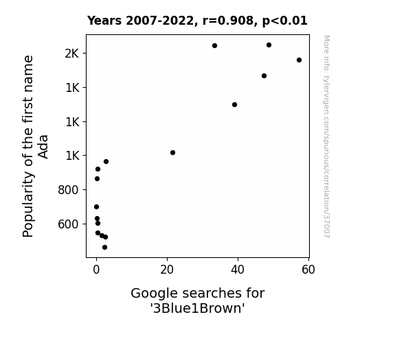 This means 82.5% of the change in the one variable (i.e., Google searches for '3Blue1Brown') is predictable based on the change in the other (i.e., Popularity of the first name Ada) over the 16 years from 2007 through 2022.