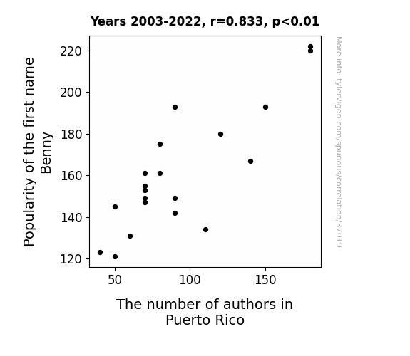 This means 69.4% of the change in the one variable (i.e., The number of authors in Puerto Rico) is predictable based on the change in the other (i.e., Popularity of the first name Benny) over the 20 years from 2003 through 2022.