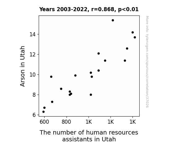 This means 75.4% of the change in the one variable (i.e., The number of human resources assistants in Utah) is predictable based on the change in the other (i.e., Arson in Utah) over the 20 years from 2003 through 2022.