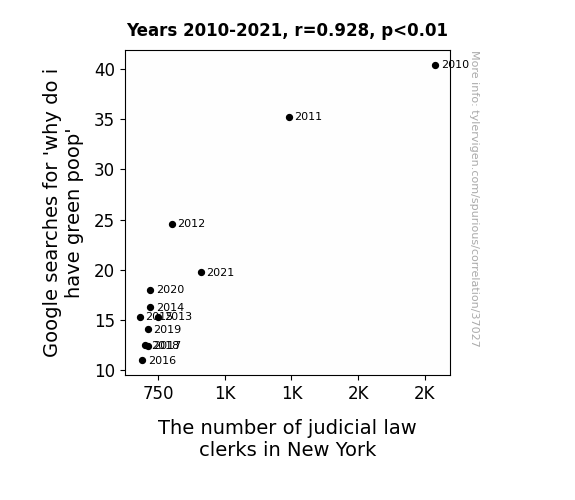 This means 86.1% of the change in the one variable (i.e., The number of judicial law clerks in New York) is predictable based on the change in the other (i.e., Google searches for 'why do i have green poop') over the 12 years from 2010 through 2021.