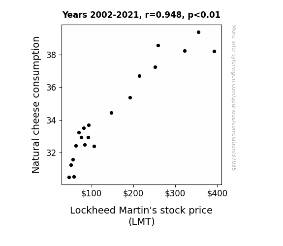 This means 89.9% of the change in the one variable (i.e., Lockheed Martin's stock price (LMT)) is predictable based on the change in the other (i.e., Natural cheese consumption) over the 20 years from 2002 through 2021.