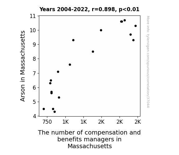 This means 80.6% of the change in the one variable (i.e., The number of compensation and benefits managers in Massachusetts) is predictable based on the change in the other (i.e., Arson in Massachusetts) over the 19 years from 2004 through 2022.