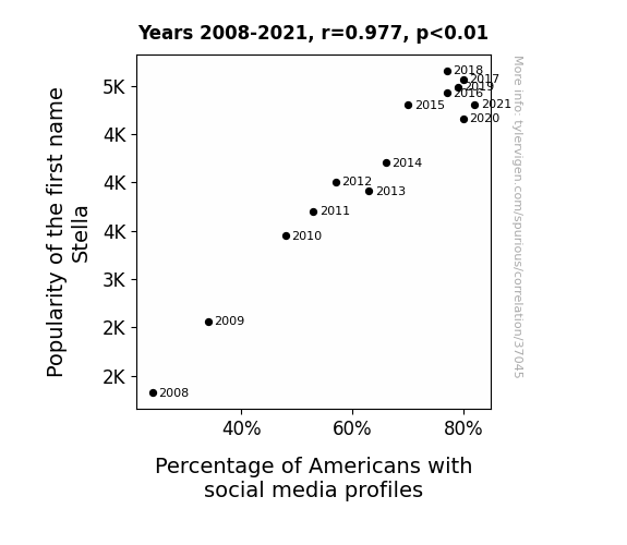 This means 95.4% of the change in the one variable (i.e., Percentage of Americans with social media profiles) is predictable based on the change in the other (i.e., Popularity of the first name Stella) over the 14 years from 2008 through 2021.