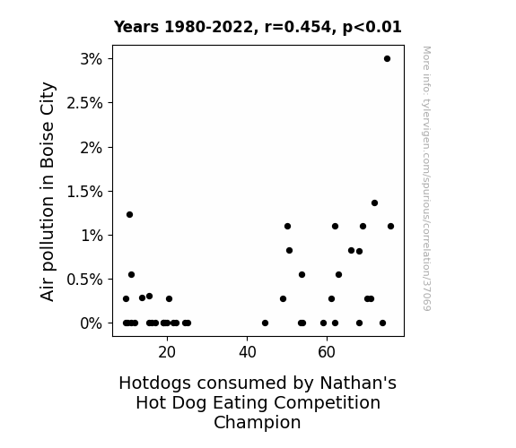 This means 20.6% of the change in the one variable (i.e., Hotdogs consumed by Nathan's Hot Dog Eating Competition Champion) is predictable based on the change in the other (i.e., Air pollution in Boise City) over the 43 years from 1980 through 2022.