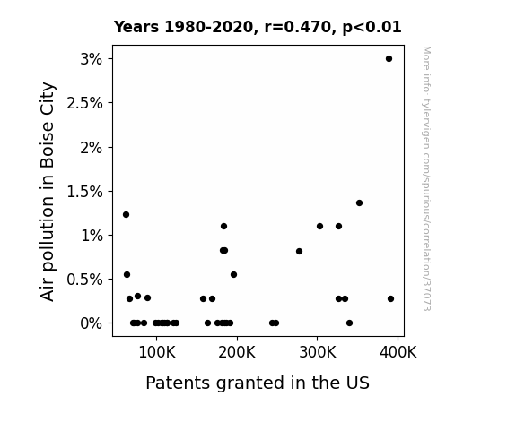 This means 22.1% of the change in the one variable (i.e., Patents granted in the US) is predictable based on the change in the other (i.e., Air pollution in Boise City) over the 41 years from 1980 through 2020.
