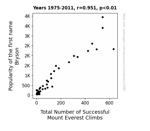 This means 90.4% of the change in the one variable (i.e., Total Number of Successful Mount Everest Climbs) is predictable based on the change in the other (i.e., Popularity of the first name Bryson) over the 37 years from 1975 through 2011.