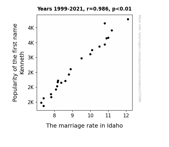 This means 97.2% of the change in the one variable (i.e., The marriage rate in Idaho) is predictable based on the change in the other (i.e., Popularity of the first name Kenneth) over the 23 years from 1999 through 2021.