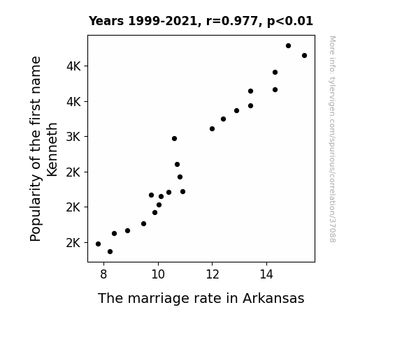 This means 95.5% of the change in the one variable (i.e., The marriage rate in Arkansas) is predictable based on the change in the other (i.e., Popularity of the first name Kenneth) over the 23 years from 1999 through 2021.