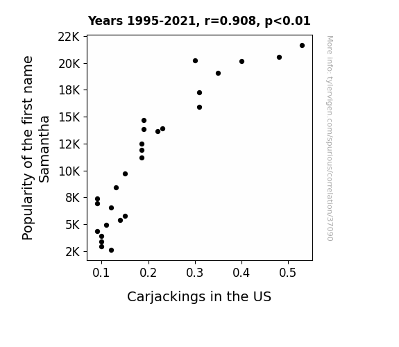 This means 82.4% of the change in the one variable (i.e., Carjackings in the US) is predictable based on the change in the other (i.e., Popularity of the first name Samantha) over the 27 years from 1995 through 2021.