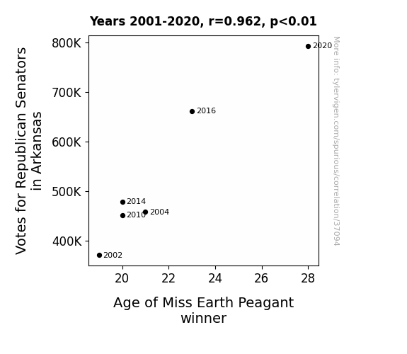 This means 92.5% of the change in the one variable (i.e., Age of Miss Earth Peagant winner) is predictable based on the change in the other (i.e., Votes for Republican Senators in Arkansas) over the 6 years from 2001 through 2020.
