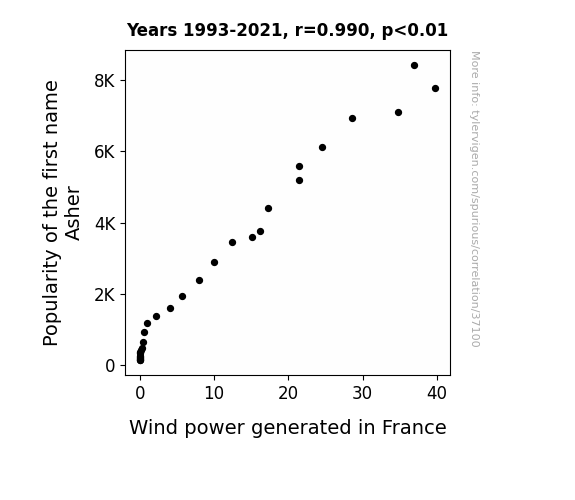 This means 98% of the change in the one variable (i.e., Wind power generated in France) is predictable based on the change in the other (i.e., Popularity of the first name Asher) over the 29 years from 1993 through 2021.