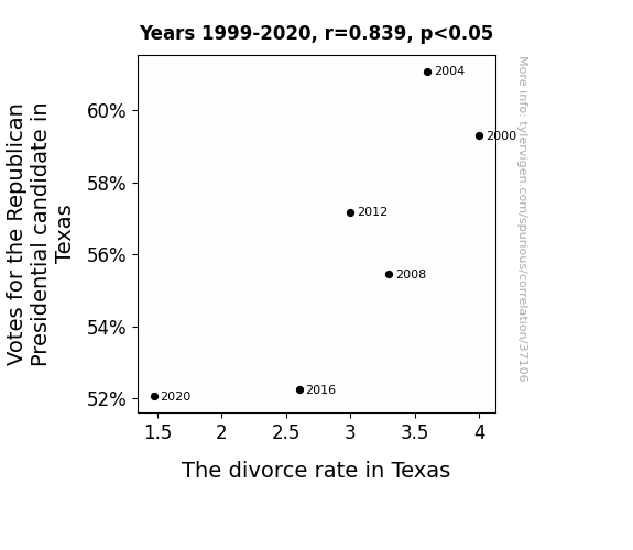 This means 70.4% of the change in the one variable (i.e., The divorce rate in Texas) is predictable based on the change in the other (i.e., Votes for the Republican Presidential candidate in Texas) over the 6 years from 1999 through 2020.
