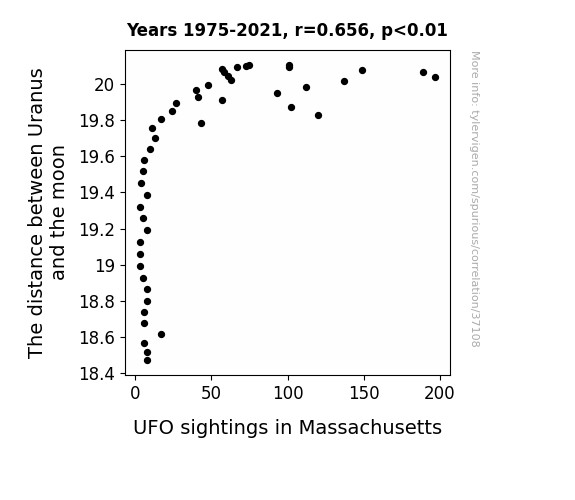 This means 43.1% of the change in the one variable (i.e., UFO sightings in Massachusetts) is predictable based on the change in the other (i.e., The distance between Uranus and the moon) over the 47 years from 1975 through 2021.