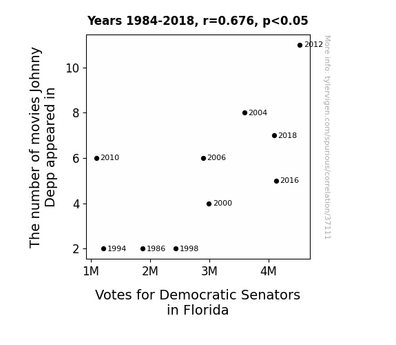 This means 45.7% of the change in the one variable (i.e., Votes for Democratic Senators in Florida) is predictable based on the change in the other (i.e., The number of movies Johnny Depp appeared in) over the 10 years from 1984 through 2018.