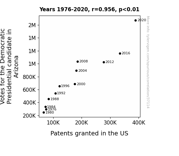 This means 91.4% of the change in the one variable (i.e., Patents granted in the US) is predictable based on the change in the other (i.e., Votes for the Democratic Presidential candidate in Arizona) over the 12 years from 1976 through 2020.