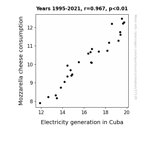 This means 93.5% of the change in the one variable (i.e., Electricity generation in Cuba) is predictable based on the change in the other (i.e., Mozzarella cheese consumption) over the 27 years from 1995 through 2021.