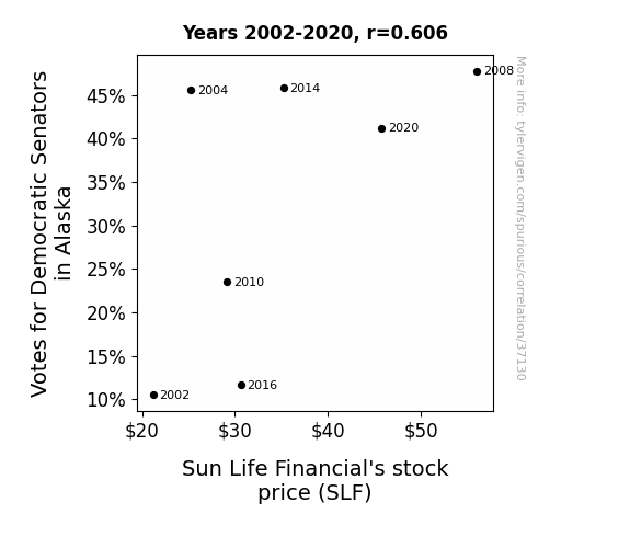 This means 36.7% of the change in the one variable (i.e., Sun Life Financial's stock price (SLF)) is predictable based on the change in the other (i.e., Votes for Democratic Senators in Alaska) over the 7 years from 2002 through 2020.