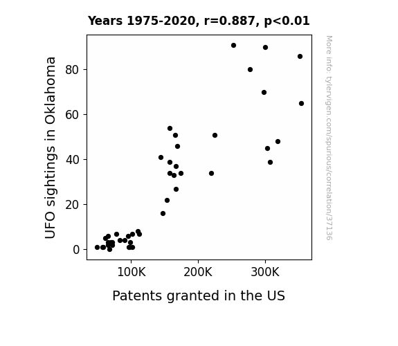 This means 78.6% of the change in the one variable (i.e., Patents granted in the US) is predictable based on the change in the other (i.e., UFO sightings in Oklahoma) over the 46 years from 1975 through 2020.