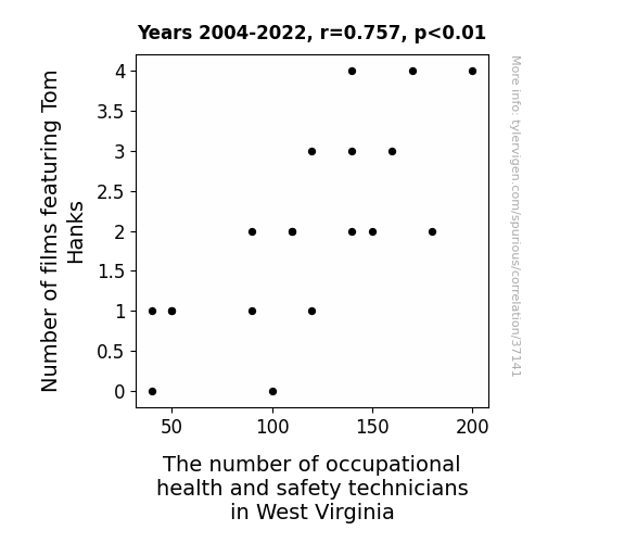This means 57.3% of the change in the one variable (i.e., The number of occupational health and safety technicians in West Virginia) is predictable based on the change in the other (i.e., Number of films featuring Tom Hanks) over the 19 years from 2004 through 2022.
