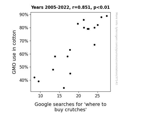 This means 72.4% of the change in the one variable (i.e., Google searches for 'where to buy crutches') is predictable based on the change in the other (i.e., GMO use in cotton) over the 18 years from 2005 through 2022.
