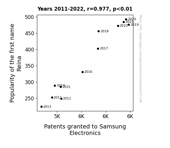 This means 95.4% of the change in the one variable (i.e., Patents granted to Samsung Electronics) is predictable based on the change in the other (i.e., Popularity of the first name Reina) over the 12 years from 2011 through 2022.