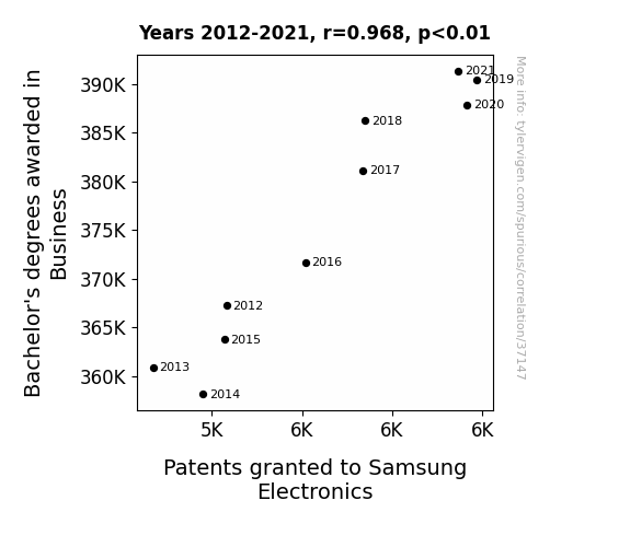 This means 93.7% of the change in the one variable (i.e., Patents granted to Samsung Electronics) is predictable based on the change in the other (i.e., Bachelor's degrees awarded in Business) over the 10 years from 2012 through 2021.