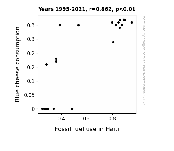 This means 74.3% of the change in the one variable (i.e., Fossil fuel use in Haiti) is predictable based on the change in the other (i.e., Blue cheese consumption) over the 27 years from 1995 through 2021.