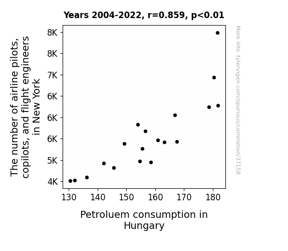 This means 73.9% of the change in the one variable (i.e., Petroluem consumption in Hungary) is predictable based on the change in the other (i.e., The number of airline pilots, copilots, and flight engineers in New York) over the 19 years from 2004 through 2022.