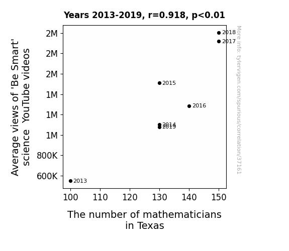 This means 84.3% of the change in the one variable (i.e., The number of mathematicians in Texas) is predictable based on the change in the other (i.e., Average views of 'Be Smart' science YouTube videos) over the 7 years from 2013 through 2019.