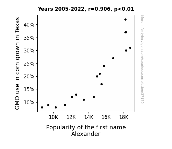 This means 82.2% of the change in the one variable (i.e., Popularity of the first name Alexander) is predictable based on the change in the other (i.e., GMO use in corn grown in Texas) over the 18 years from 2005 through 2022.