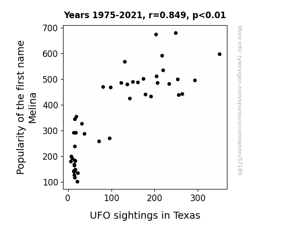 This means 72% of the change in the one variable (i.e., UFO sightings in Texas) is predictable based on the change in the other (i.e., Popularity of the first name Melina) over the 47 years from 1975 through 2021.