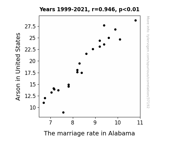 This means 89.4% of the change in the one variable (i.e., The marriage rate in Alabama) is predictable based on the change in the other (i.e., Arson in United States) over the 23 years from 1999 through 2021.