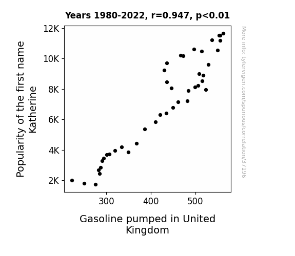 This means 89.7% of the change in the one variable (i.e., Gasoline pumped in United Kingdom) is predictable based on the change in the other (i.e., Popularity of the first name Katherine) over the 43 years from 1980 through 2022.