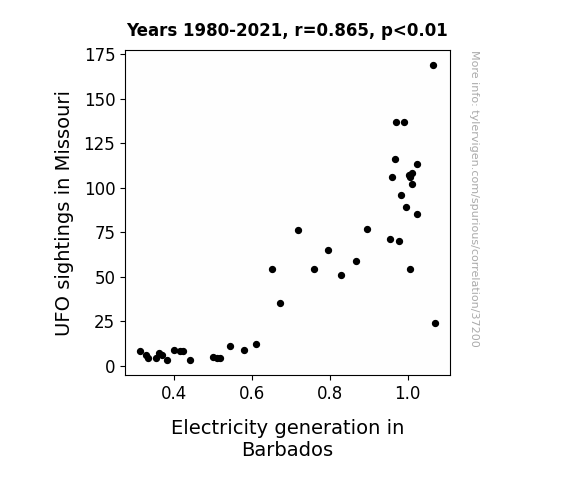 This means 74.8% of the change in the one variable (i.e., Electricity generation in Barbados) is predictable based on the change in the other (i.e., UFO sightings in Missouri) over the 42 years from 1980 through 2021.