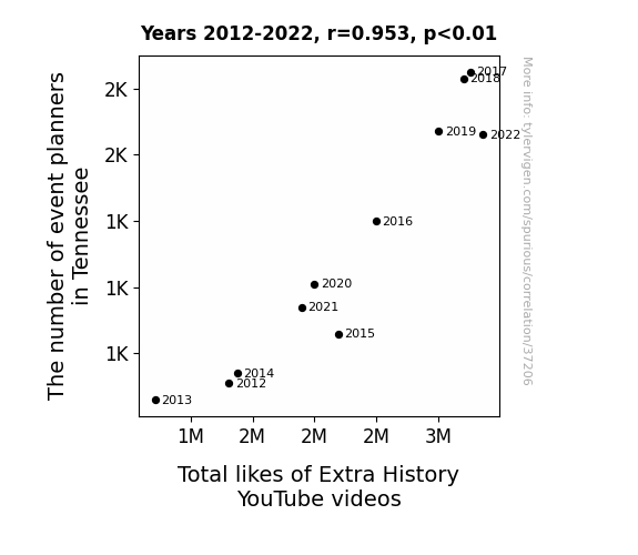 This means 90.9% of the change in the one variable (i.e., Total likes of Extra History YouTube videos) is predictable based on the change in the other (i.e., The number of event planners in Tennessee) over the 11 years from 2012 through 2022.
