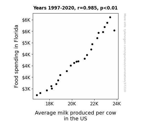 This means 97% of the change in the one variable (i.e., Average milk produced per cow in the US) is predictable based on the change in the other (i.e., Food spending in Florida) over the 24 years from 1997 through 2020.