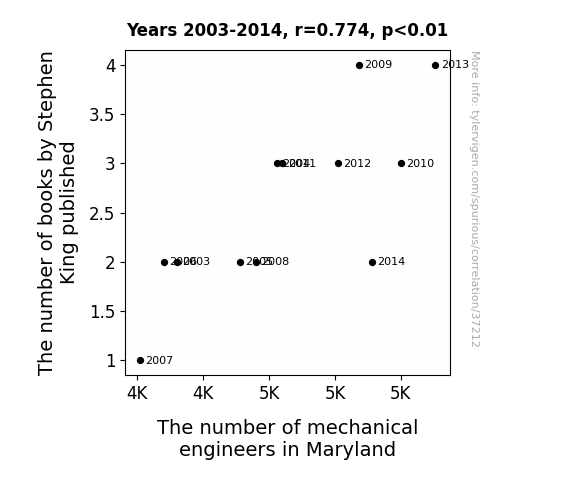 This means 60% of the change in the one variable (i.e., The number of mechanical engineers in Maryland) is predictable based on the change in the other (i.e., The number of books by Stephen King published) over the 12 years from 2003 through 2014.