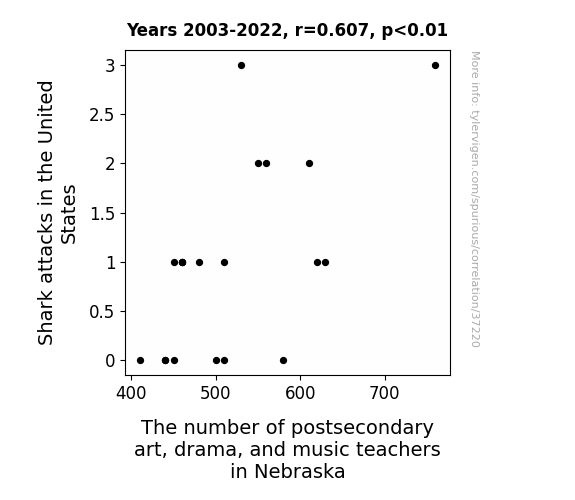 This means 36.9% of the change in the one variable (i.e., The number of postsecondary art, drama, and music teachers in Nebraska) is predictable based on the change in the other (i.e., Shark attacks in the United States) over the 20 years from 2003 through 2022.
