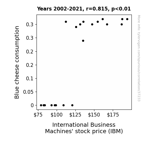 This means 66.3% of the change in the one variable (i.e., International Business Machines' stock price (IBM)) is predictable based on the change in the other (i.e., Blue cheese consumption) over the 20 years from 2002 through 2021.