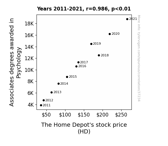 This means 97.3% of the change in the one variable (i.e., The Home Depot's stock price (HD)) is predictable based on the change in the other (i.e., Associates degrees awarded in Psychology) over the 11 years from 2011 through 2021.