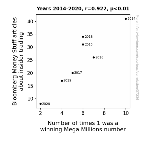 This means 85% of the change in the one variable (i.e., Number of times 1 was a winning Mega Millions number) is predictable based on the change in the other (i.e., Bloomberg Money Stuff articles about insider trading) over the 7 years from 2014 through 2020.